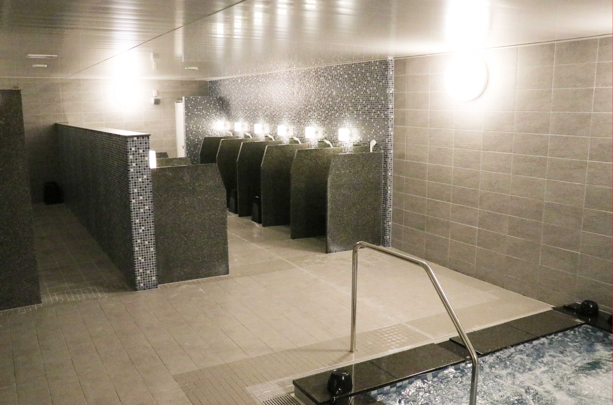 広々とした浴室と洗い場。洗い場には仕切りを設けているため快適にご利用いただけます。サウナも完備しています。