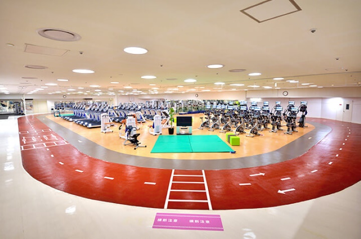 1周100mのトラックが象徴的なジムエリアには種類豊富なトレーニングマシンが揃います。初心者エリア、ストレッチエリア、フリーウエイトエリアなどがございます。